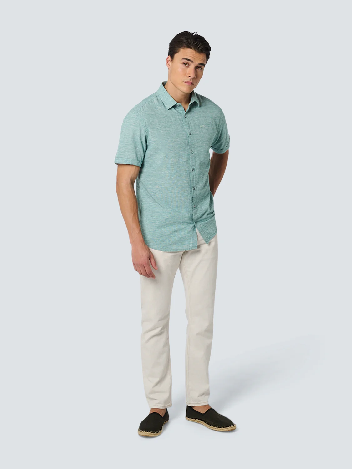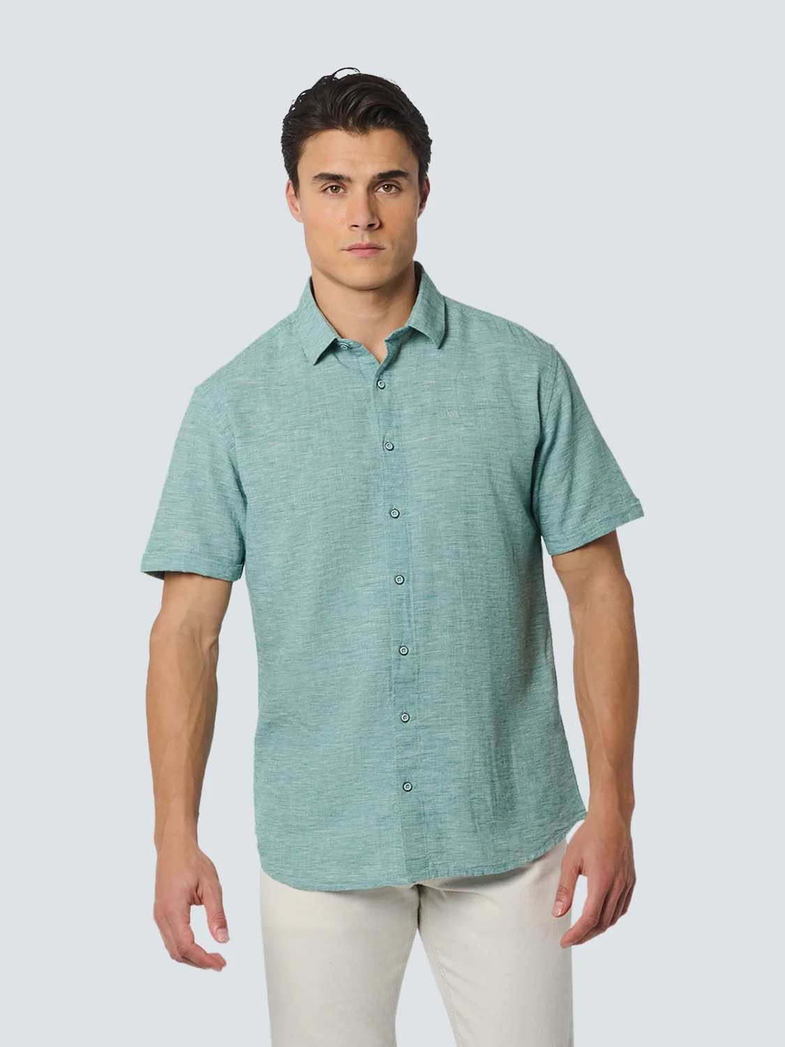 Chemise classique à manches courtes de No Excess. Fabriquée à partir d’un mélange de coton et de lin, elle offre une sensation de légèreté et de respirabilité, ce qui la rend idéale pour la saison estivale. L’effet mélangé crée un effet de couleur bicolore distinctif sur toute la chemise. Polyvalente et adaptée à toutes les occasions, cette chemise est un ajout indispensable à votre garde-robe.