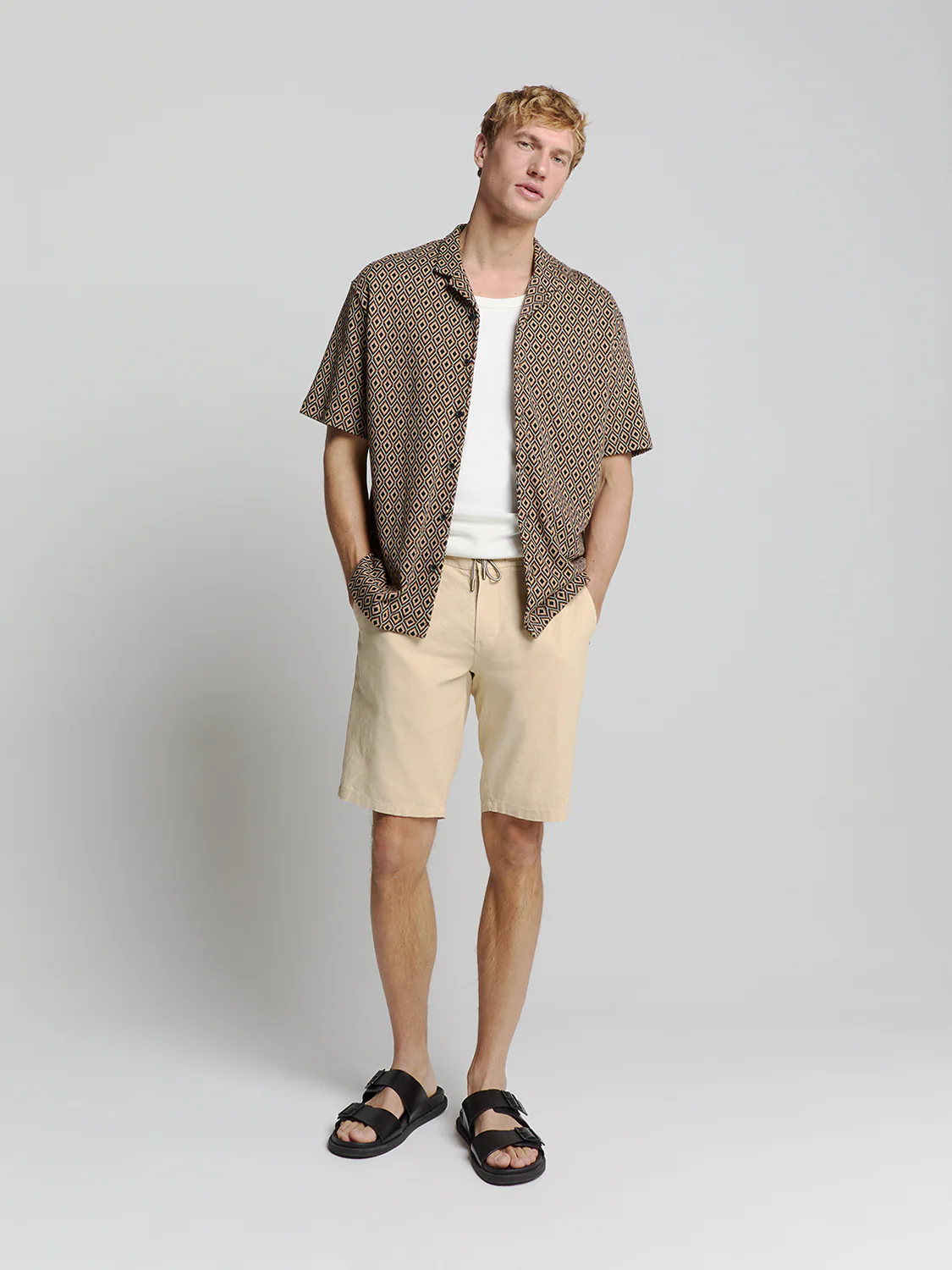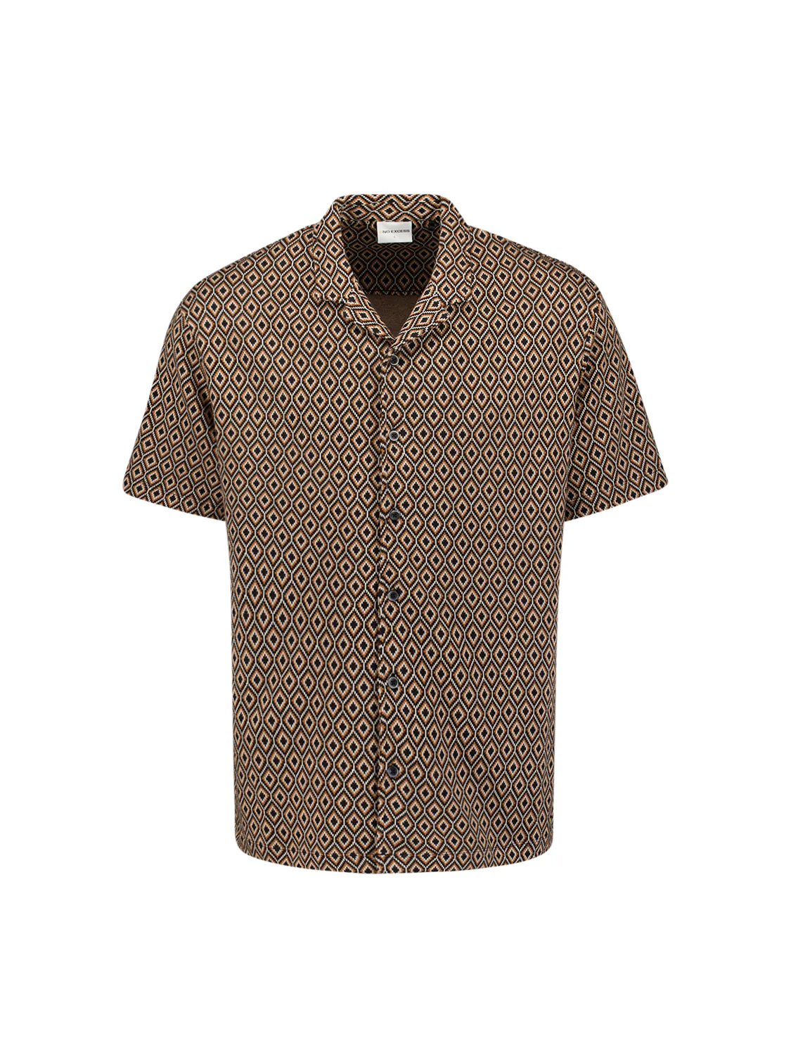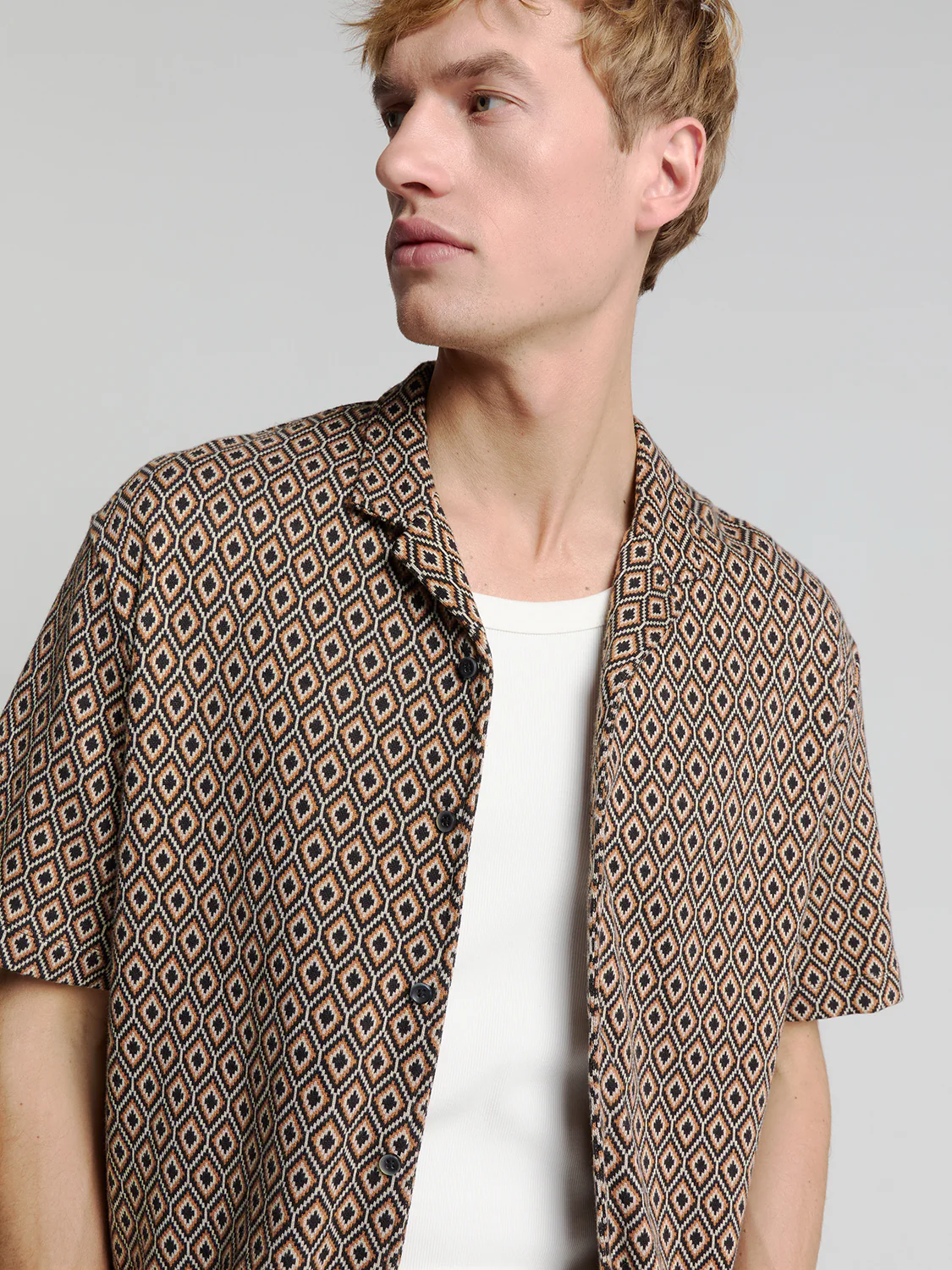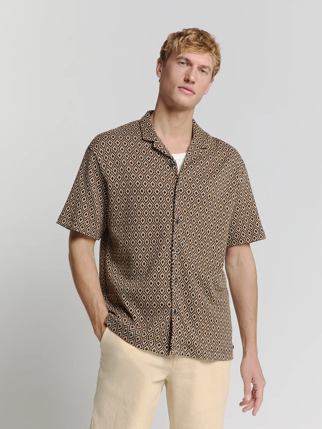 Chemise en jersey à manches courtes avec imprimé intégral d’inspiration rétro. Confectionnée dans un tissu doux et extensible, avec un col à revers classique – parfaite pour un look estival décontracté et stylé.