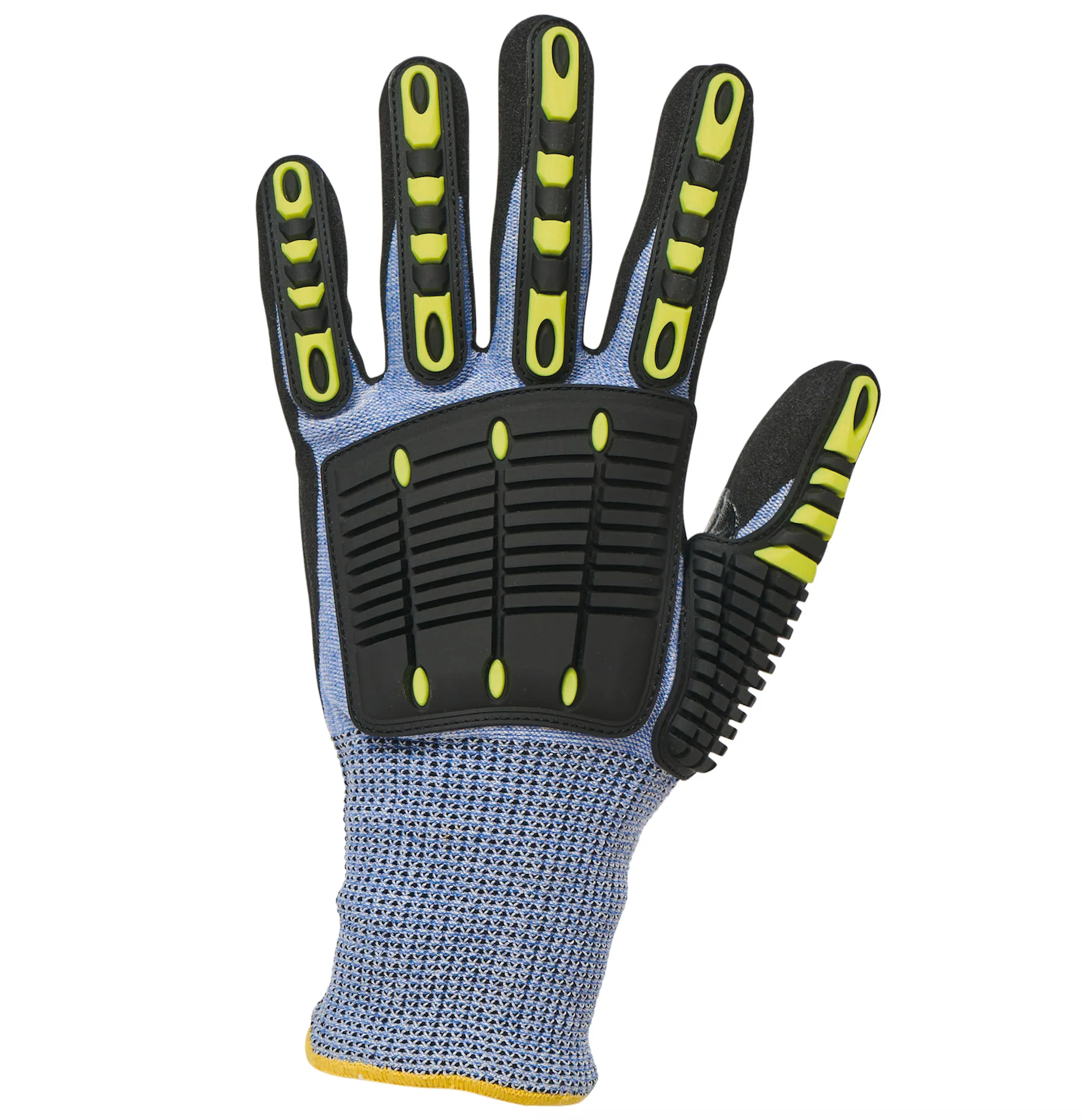 Support tricoté en HPPE, fibre d’acier, polyester et élasthanne. L’HPPE (polyéthylène haute performance) offre une résistance supérieure aux coupures tout en étant léger et confortable. La fibre d’acier intégrée dans le tricot apporte une protection supplémentaire contre les coupures et les impacts. Le mélange de polyester et d’élasthanne assure une flexibilité et un ajustement optimal, garantissant un confort lors d’une utilisation prolongée. L’enduction en sandy nitrile sur la paume et les doigts offre une excellente adhérence et une résistance à l’abrasion, prolongeant ainsi la durée de vie des gants même dans des conditions de travail exigeantes. Les renforts en PVC sur le dos et les doigts ajoutent une protection supplémentaire contre les impacts et l’écrasement. Le renfort en sandy nitrile entre le pouce et l’index assure une protection renforcée dans les zones de haute usure.