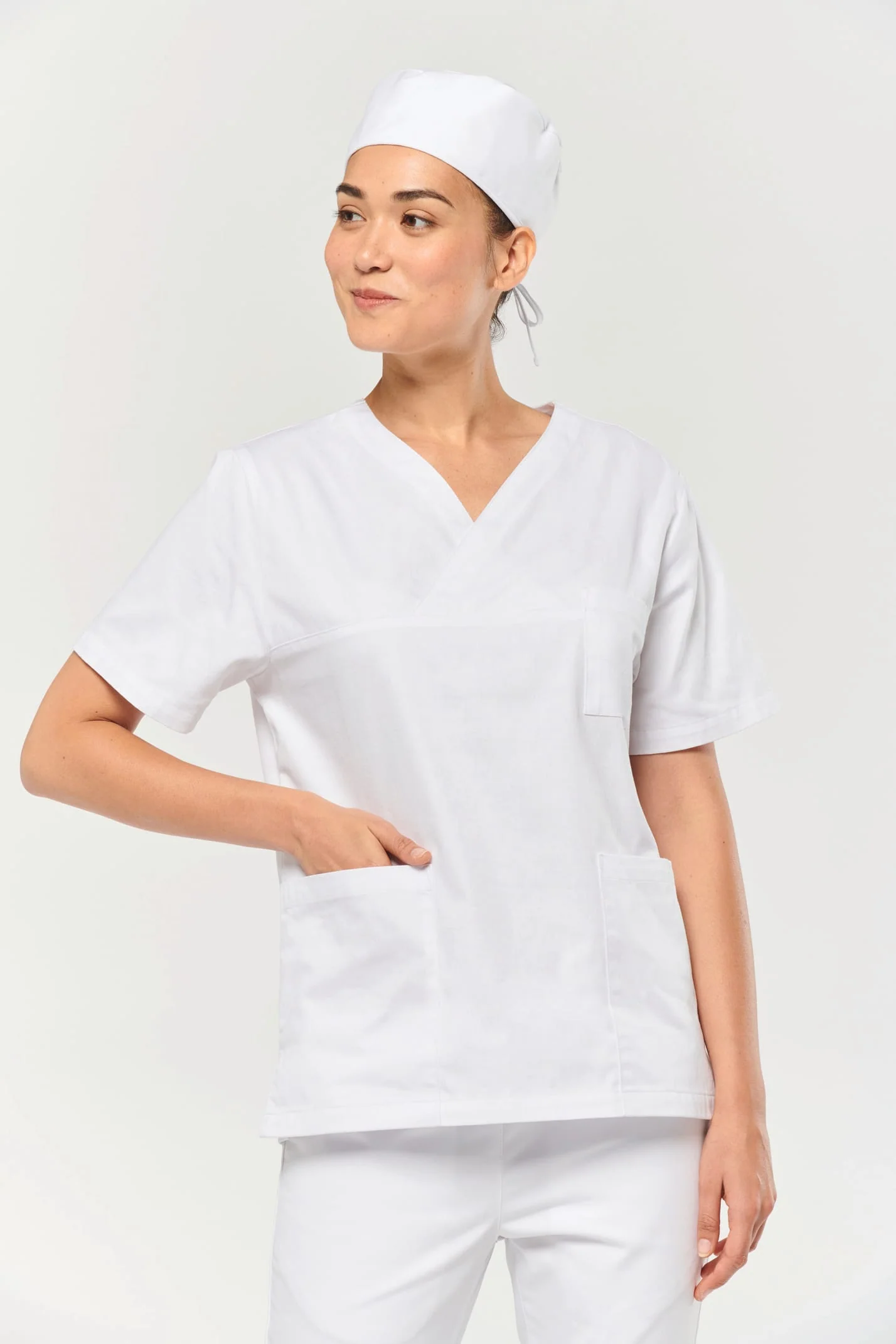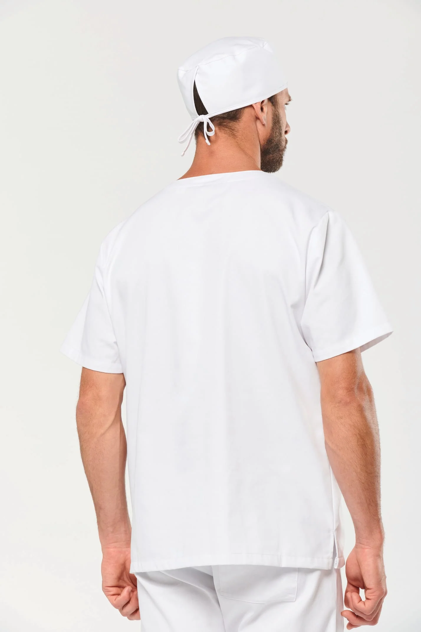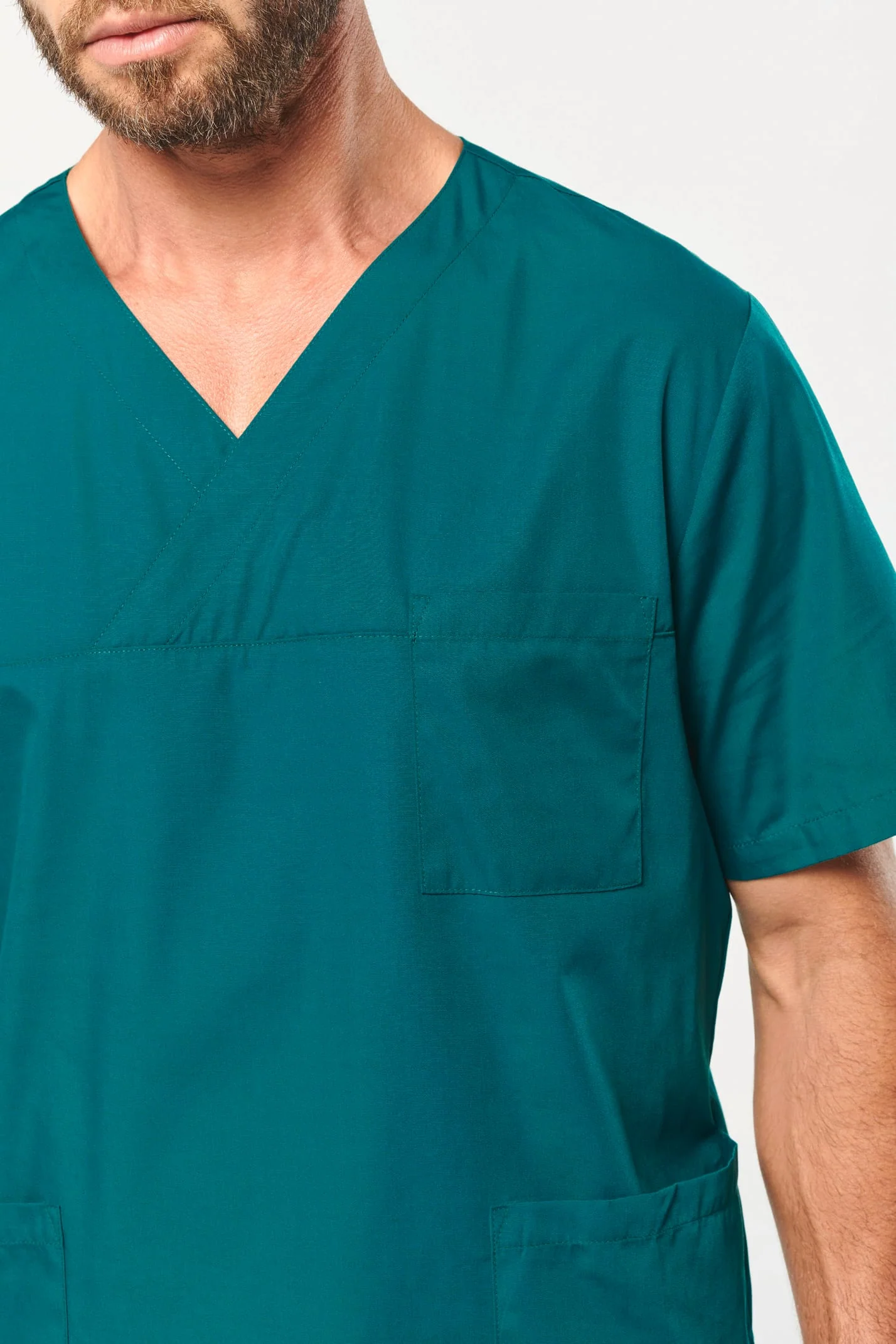 65% polyester / 35% coton. Tissu sergé. Norme ISO 15797 lavage industriel 75°C (20 lavages). Coupe confort. Encolure en V croisée. Poche plaquée poitrine côté cœur. 2 grandes poches plaquées avant. 2 fentes d’aisance latérales. Etiquette nom à l’intérieur du vêtement. Etiquette de marque Tear Away.